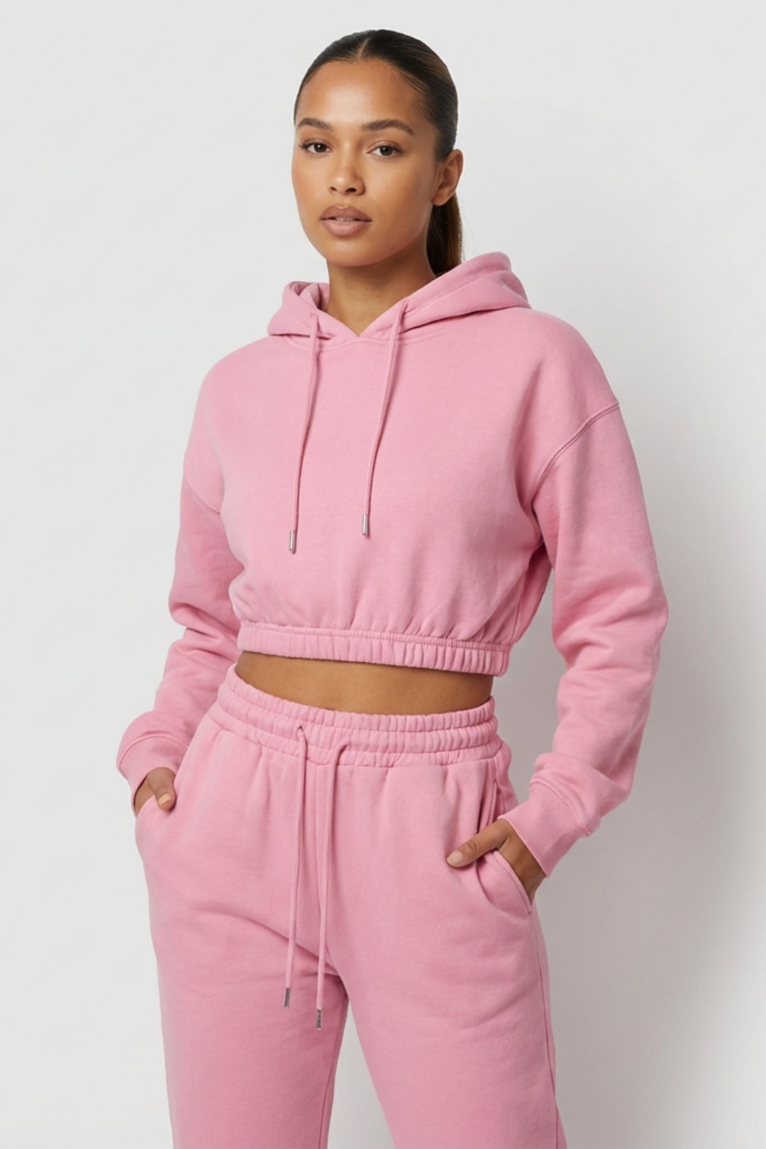 - Trendy fit: Cropped hoodie combined with joggers with an elastic waistband.